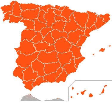 Zaragoza Teruel La Coruña Pontevedra Lugo Orense Asturias Cantabria Leon Palencia Zamora Valladolid Burgos Salamanca Cáceres Badajoz Huelva Cádiz Málaga Sevilla Granada Almería Murcia Alicante Valencia Castellón Tarragona Barcelona Gerona Lérida Huesca Cuenca Soria Guadalajara Madrid Segovia Ávila Toledo Córdoba Ciudad Real Albacete Jaén Navarra La Rioja Araba Bizkaia Gipuzkoa Islas Baleares Santa Cruz de Tenerife Las Palmas Ceuta Melilla